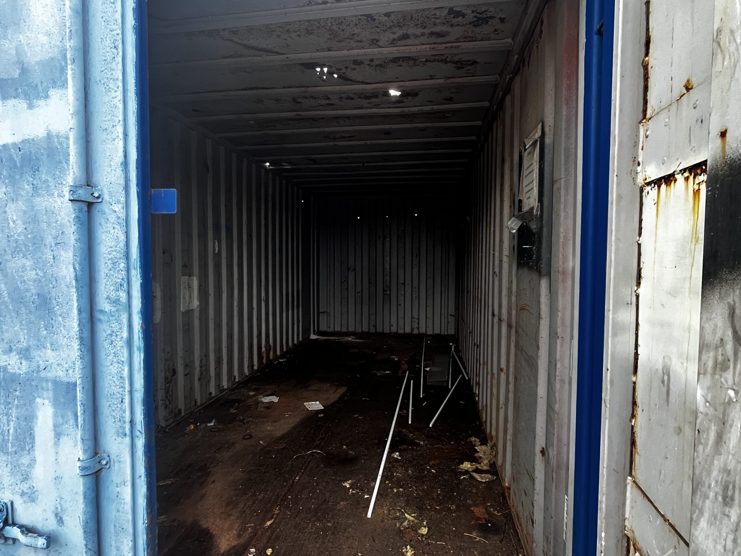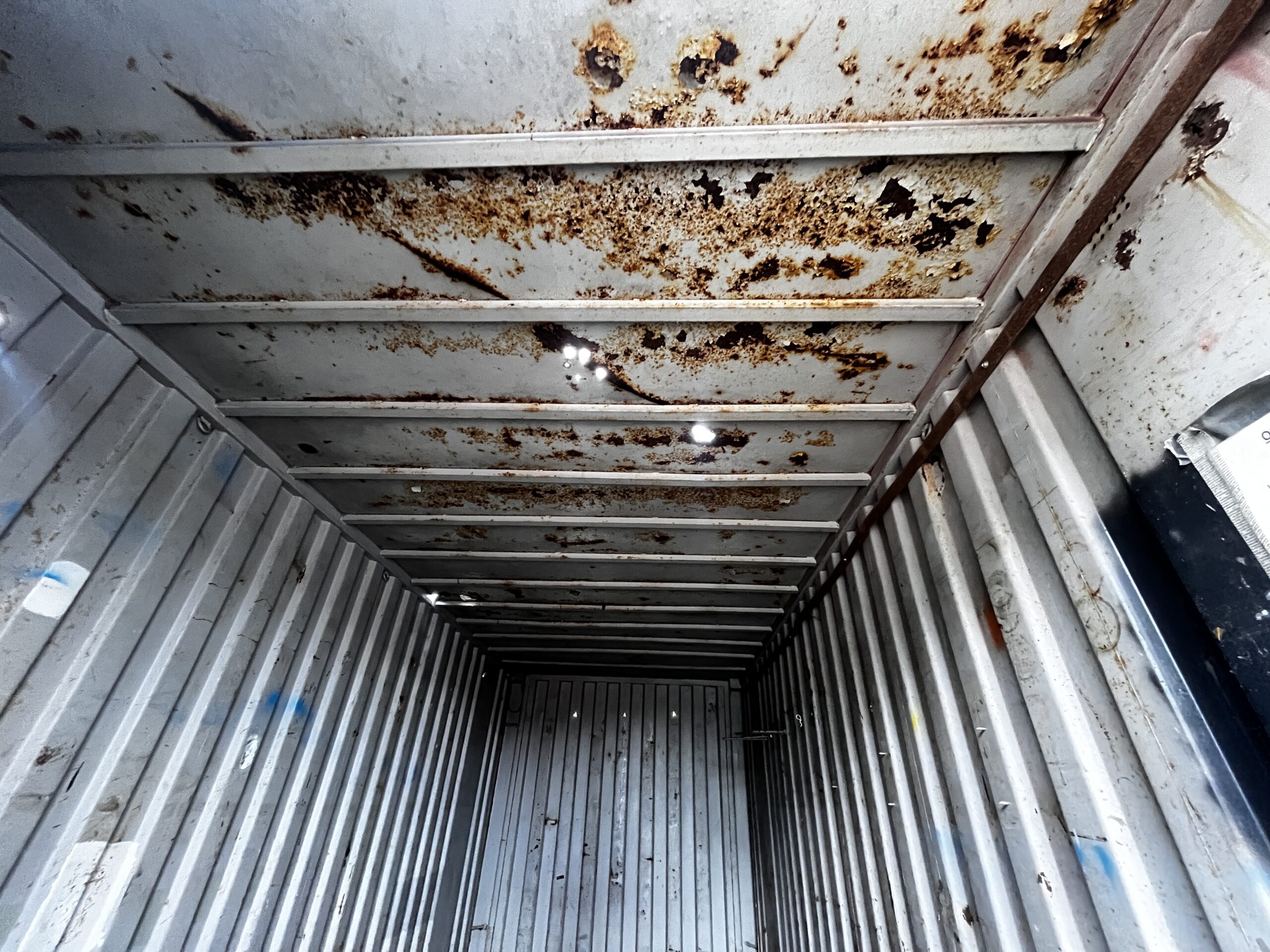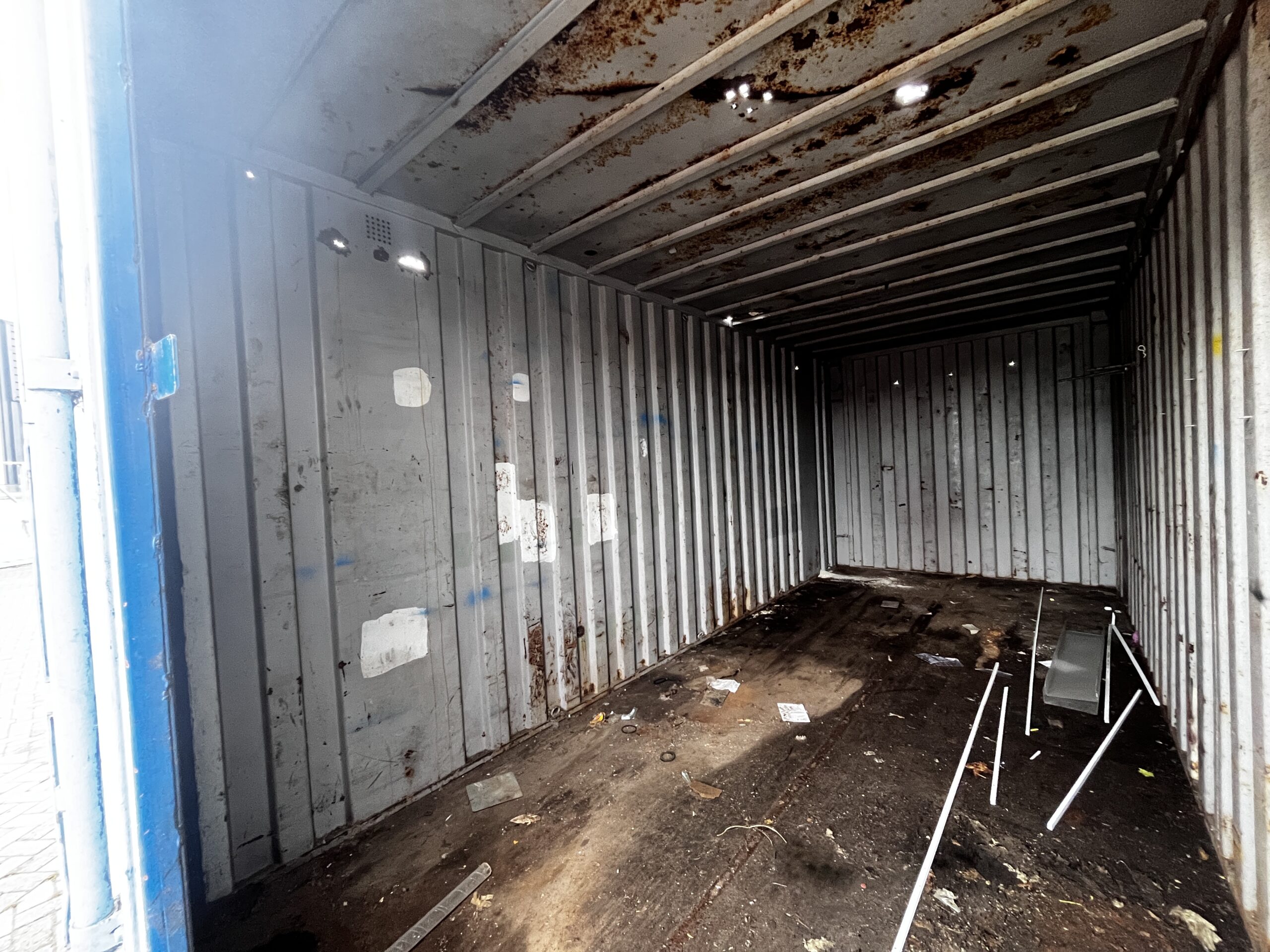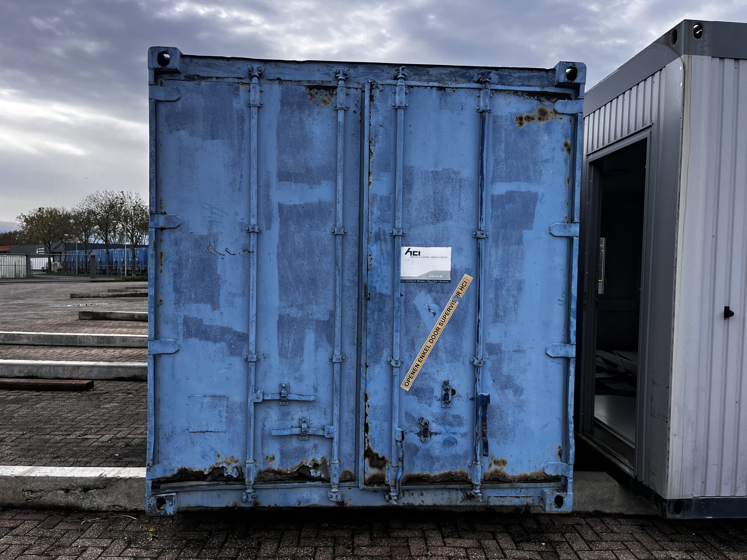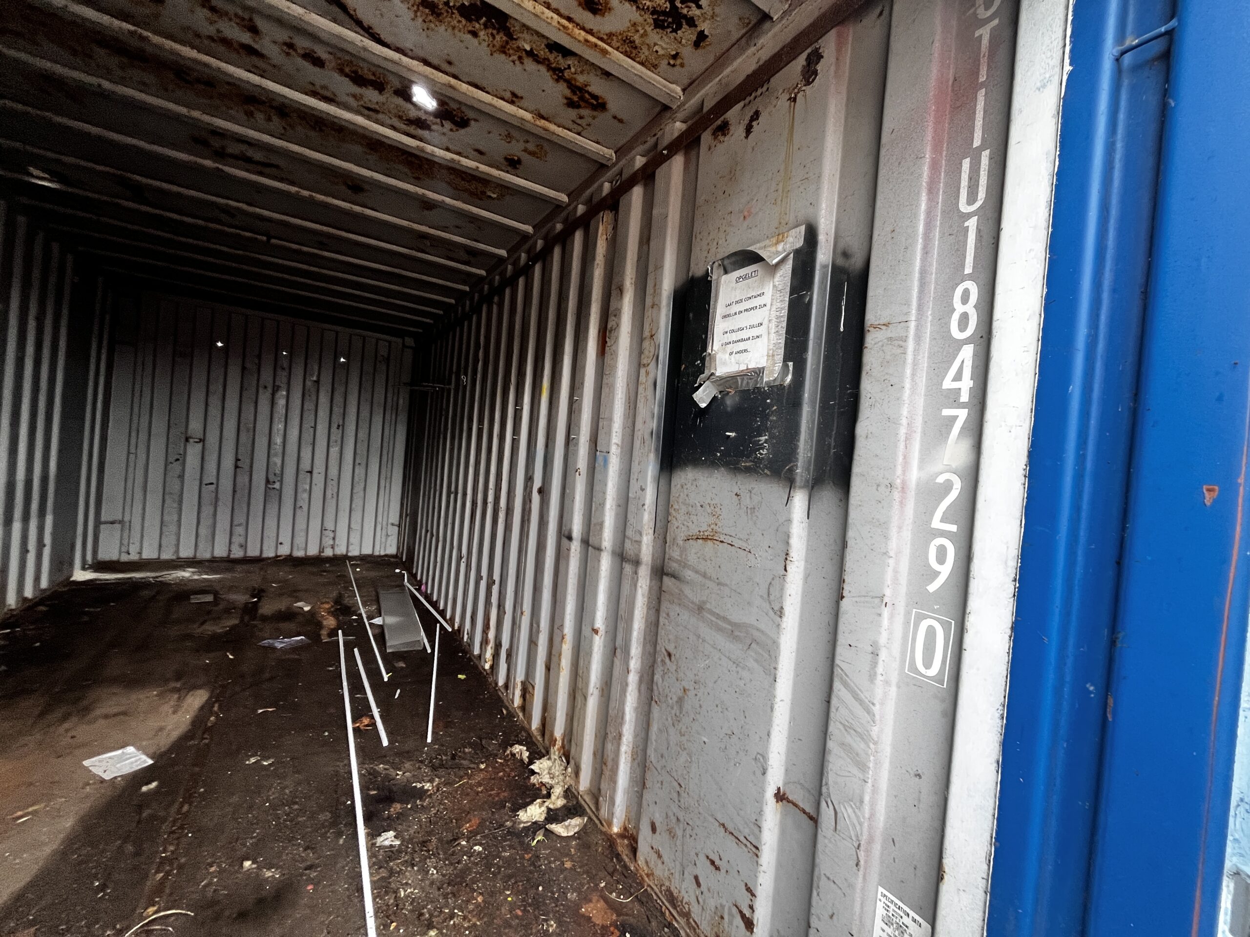 Luchtige 20ft opslagcontainer, met enkele open plekken op wanden en dak (zie foto's).
