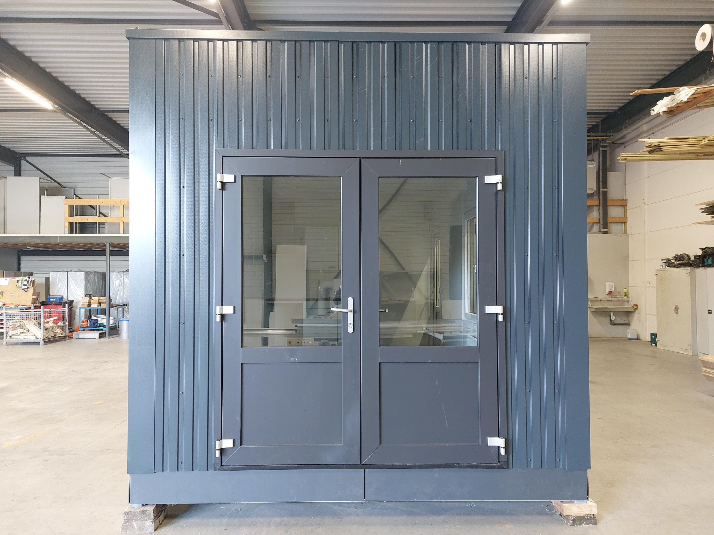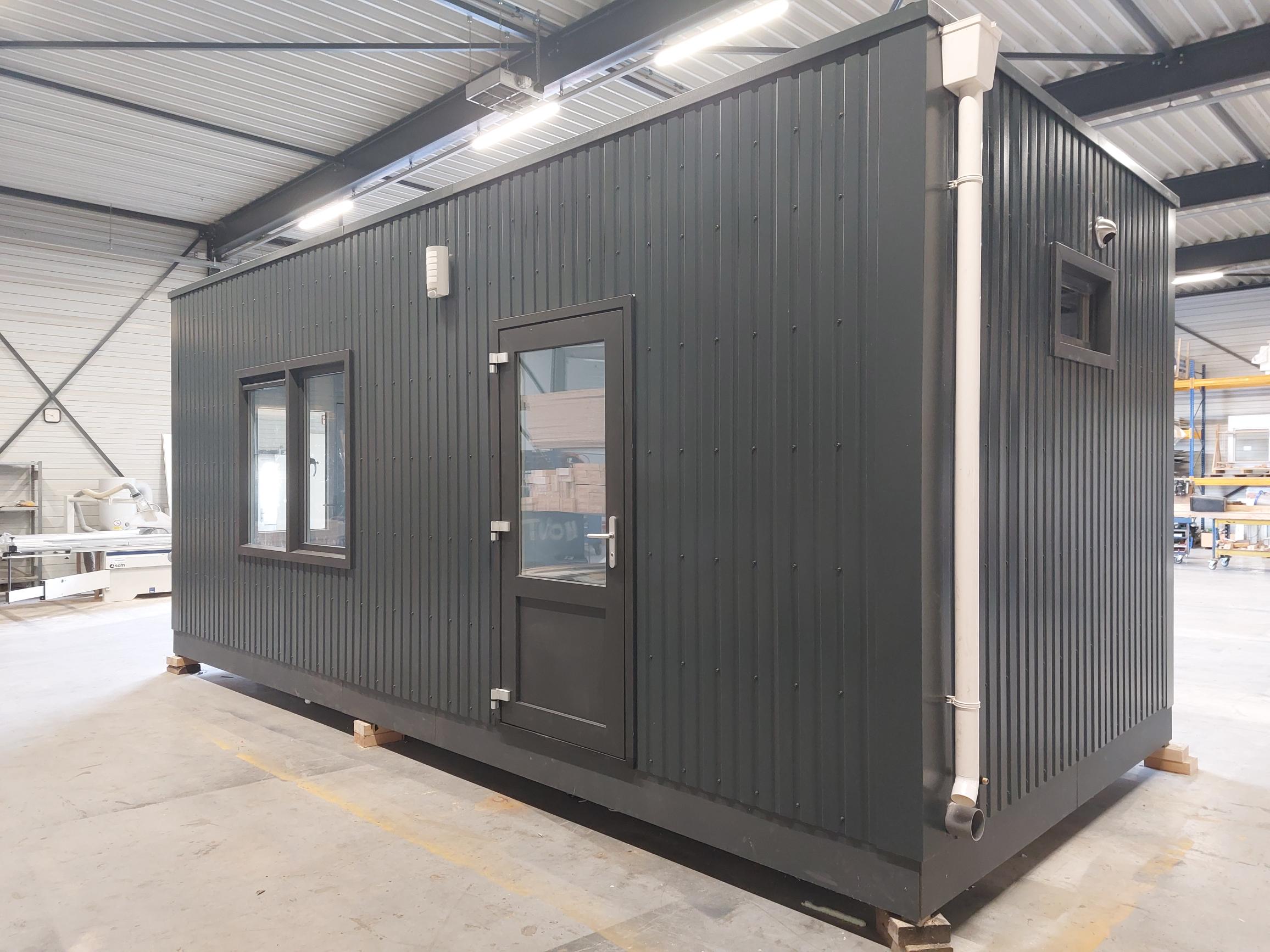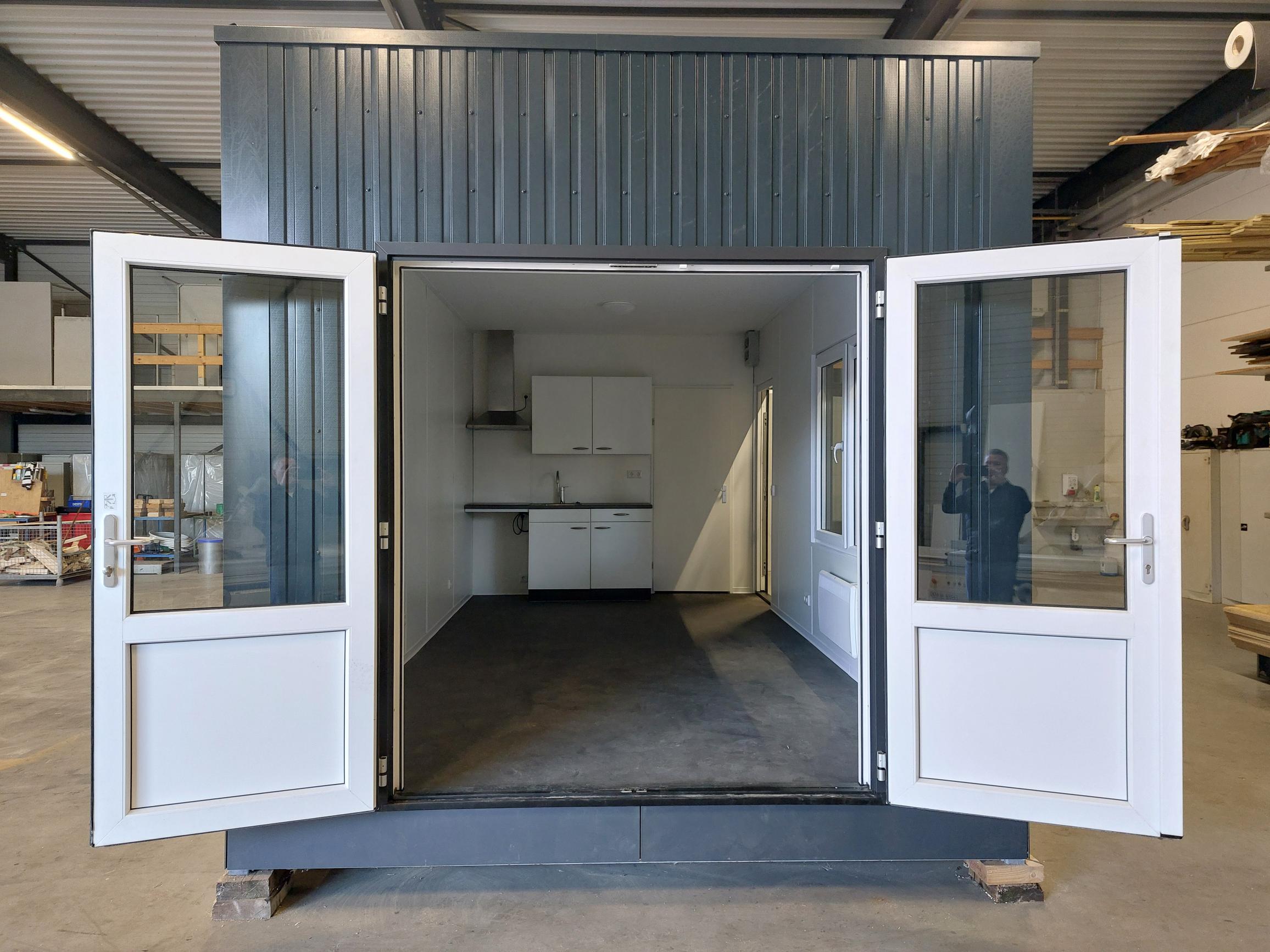 De woonkamer is verder uitgerust met een keukenblok, openslaande deuren en kunststof draai-kiepramen.